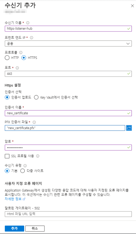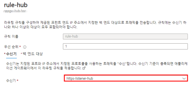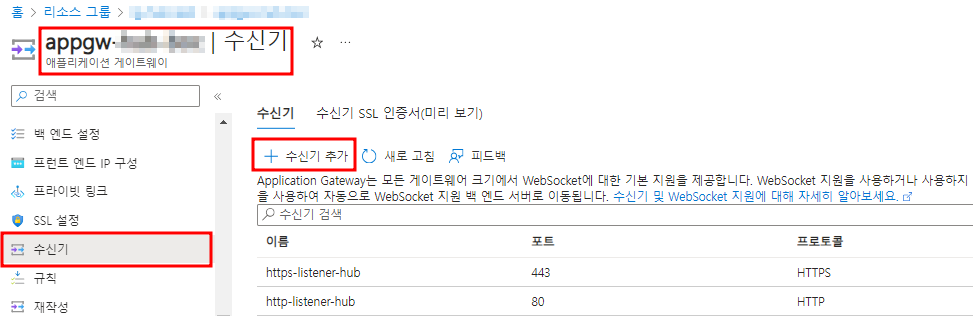 a. Azure Portal 접속 후 [애플리케이션 게이트웨이] → [수신기] → [수신기 추가] 선택