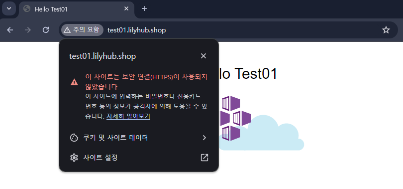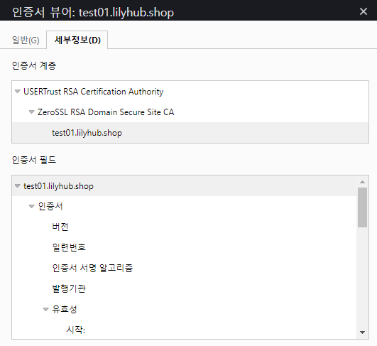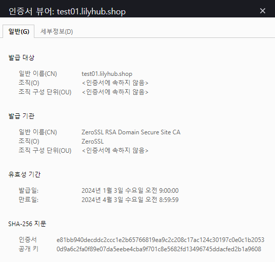 - https 적용 시 보안 경고 메시지가 사라지고 등록한 인증서 정보를 확인할 수 있다.