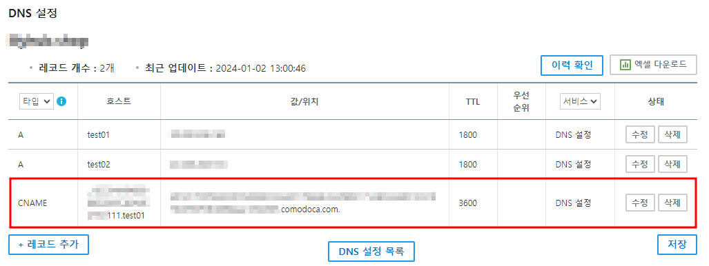 - 호스트: DNS(CNAME) 정보의 Name에서 맨 뒤의 domain name은 빼고 입력