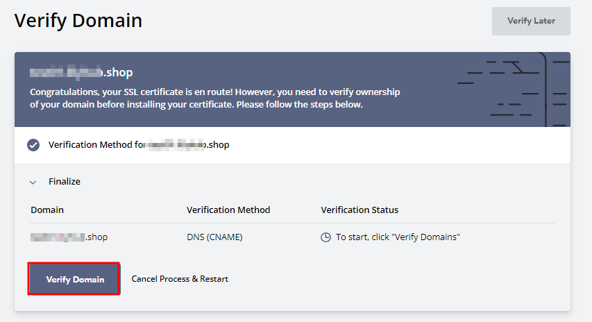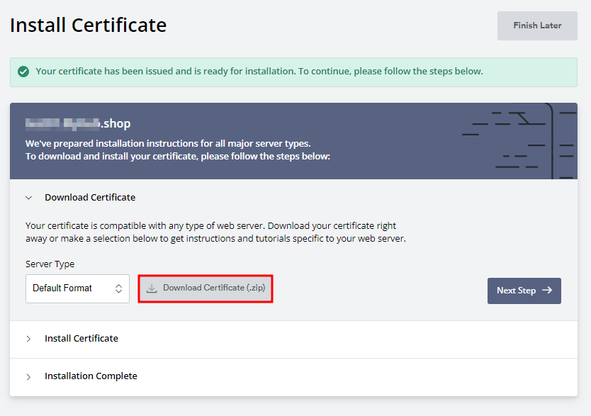 12) 도메인 확인이 완료되면 [Download Certificate (.zip)] 클릭 후 인증서 다운로드