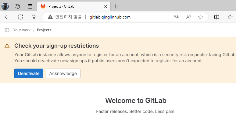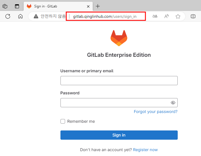 # 웹 브라우저로 https://아이피주소 또는 https://도메인 으로 접속해서 아래의 사진처럼 GitLab이 정상적으로 동작하는지 확인한다.