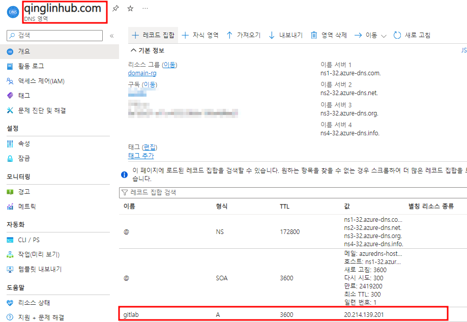 - 개인 도메인와 gitlab 접속 ip(http://20.214.139.201:80) 을 매핑하기 위하여 DNS 설정에서 A 레코드로 IP를 추가한다.