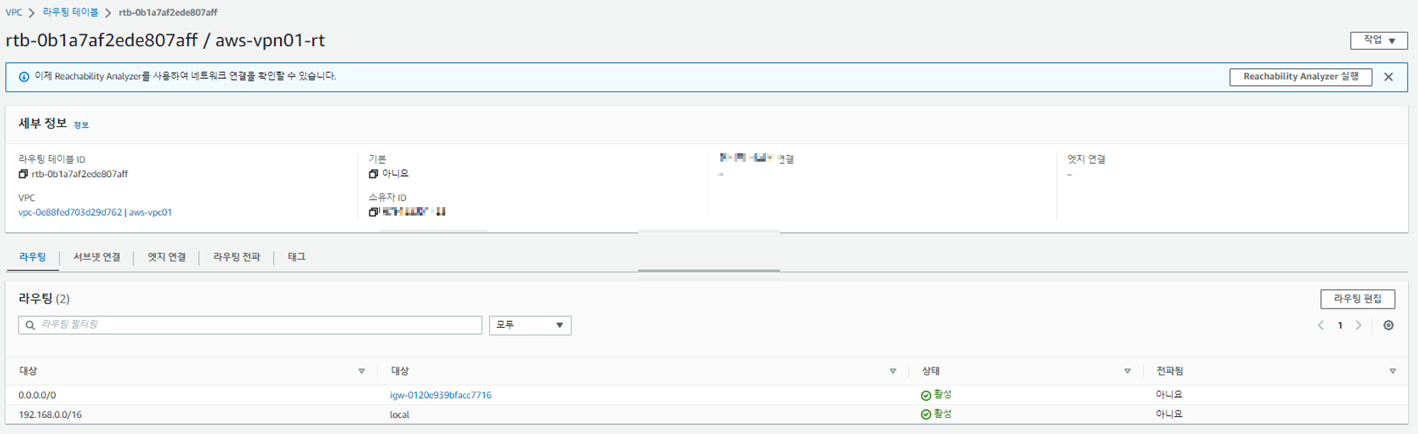 - 라우팅 테이블에서 0.0.0.0/0 → 인터넷 게이트웨이로 라우팅 편집