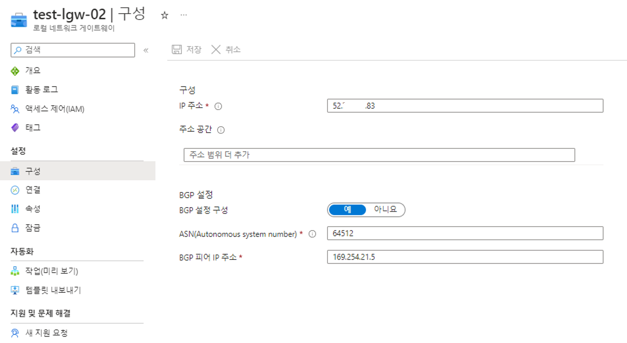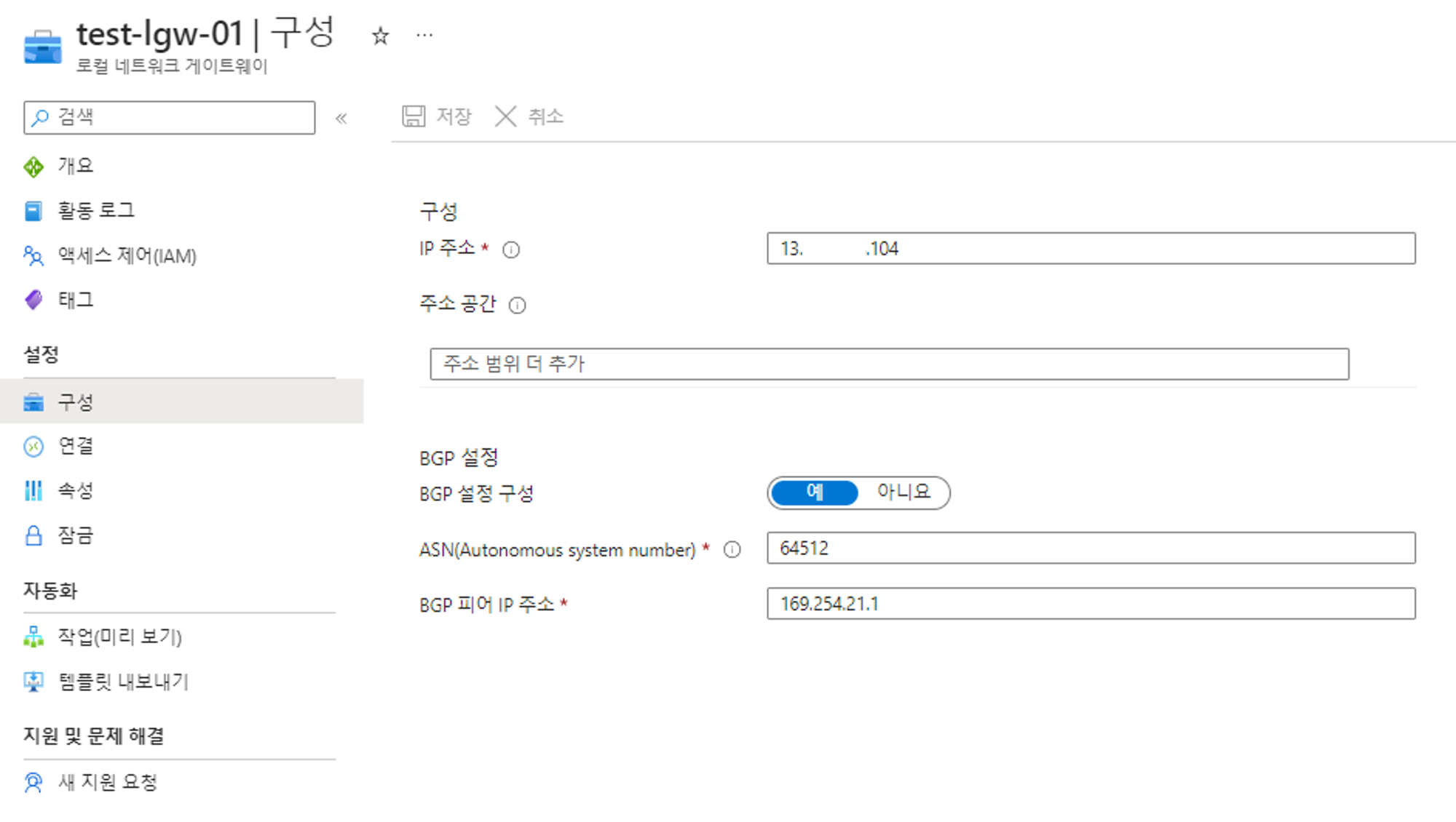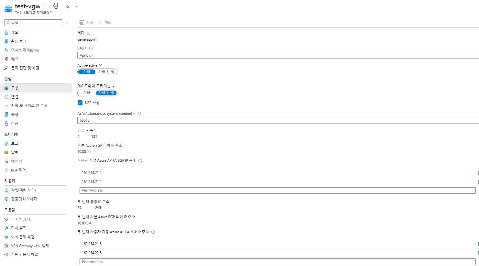 - BGP ASN: 65515 (Azure VPN 게이트웨이의 ASN)