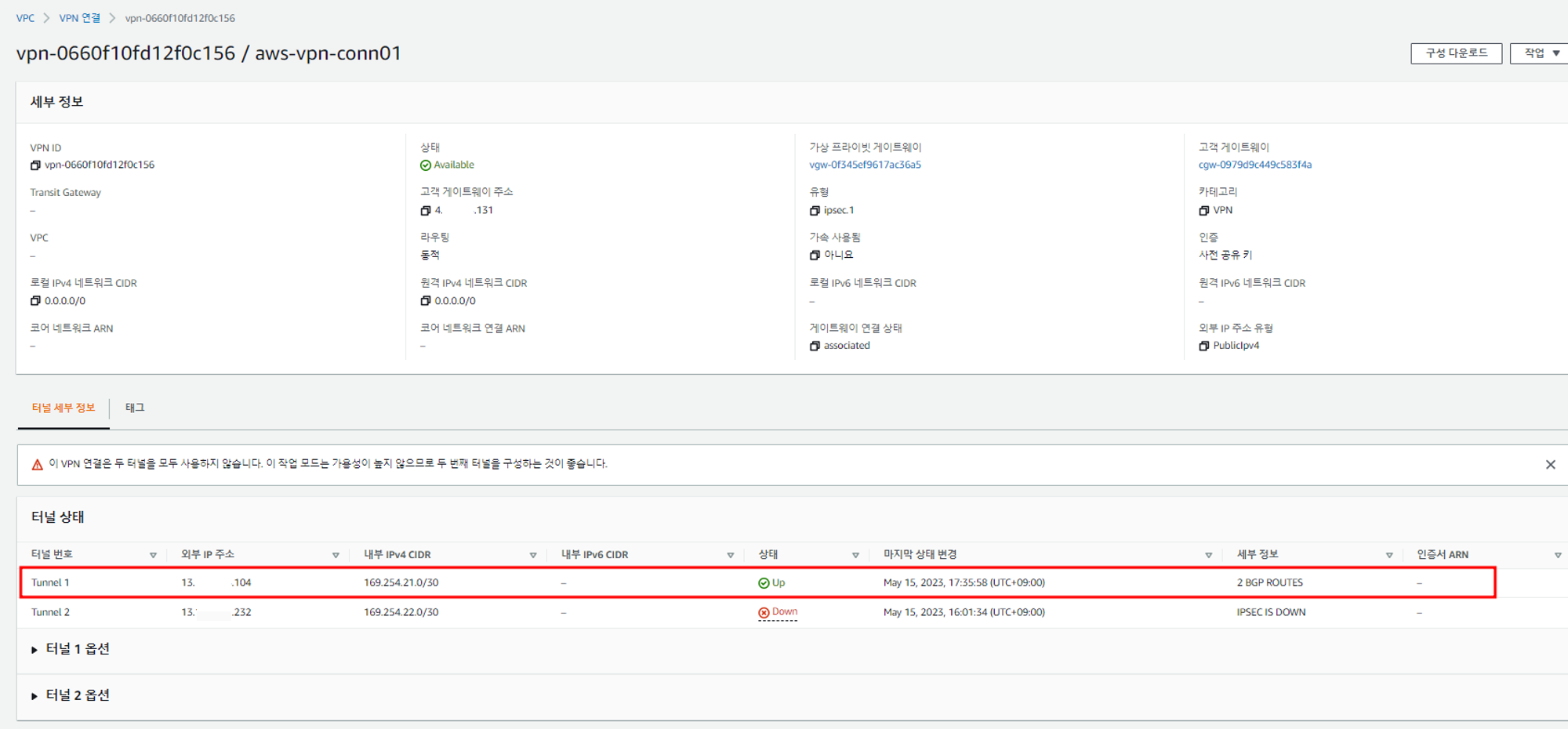 - Tunnel 1개만 up 되어 있어도 당장 사용은 가능하지만 Tunnel 장애 발생하면 바로 연결이 끊기기 때문에 이중화를 위해 Tunnel 2개를 모두 설정해서 사용하는 것을 권장한다.
