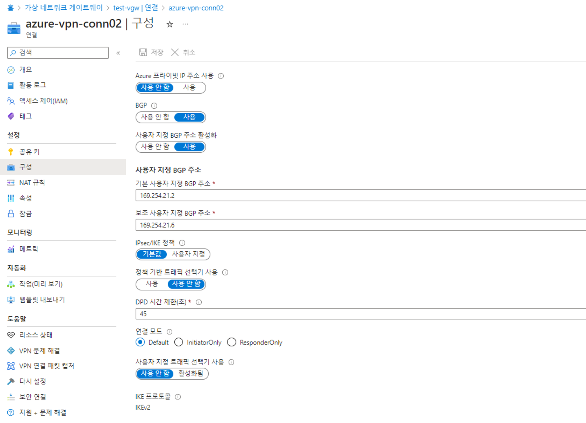 - 사용자 지정 Azure APIPA BGP IP 주소: 169.254.21.2, 169.254.22.2 (BGP APIPA 구성표 참고)