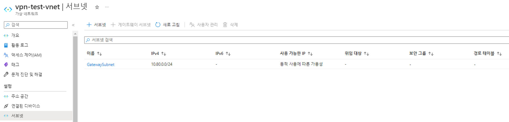 - VPN용 서브넷의 이름은 반드시 GatewaySubnet 으로 지정해야한다.