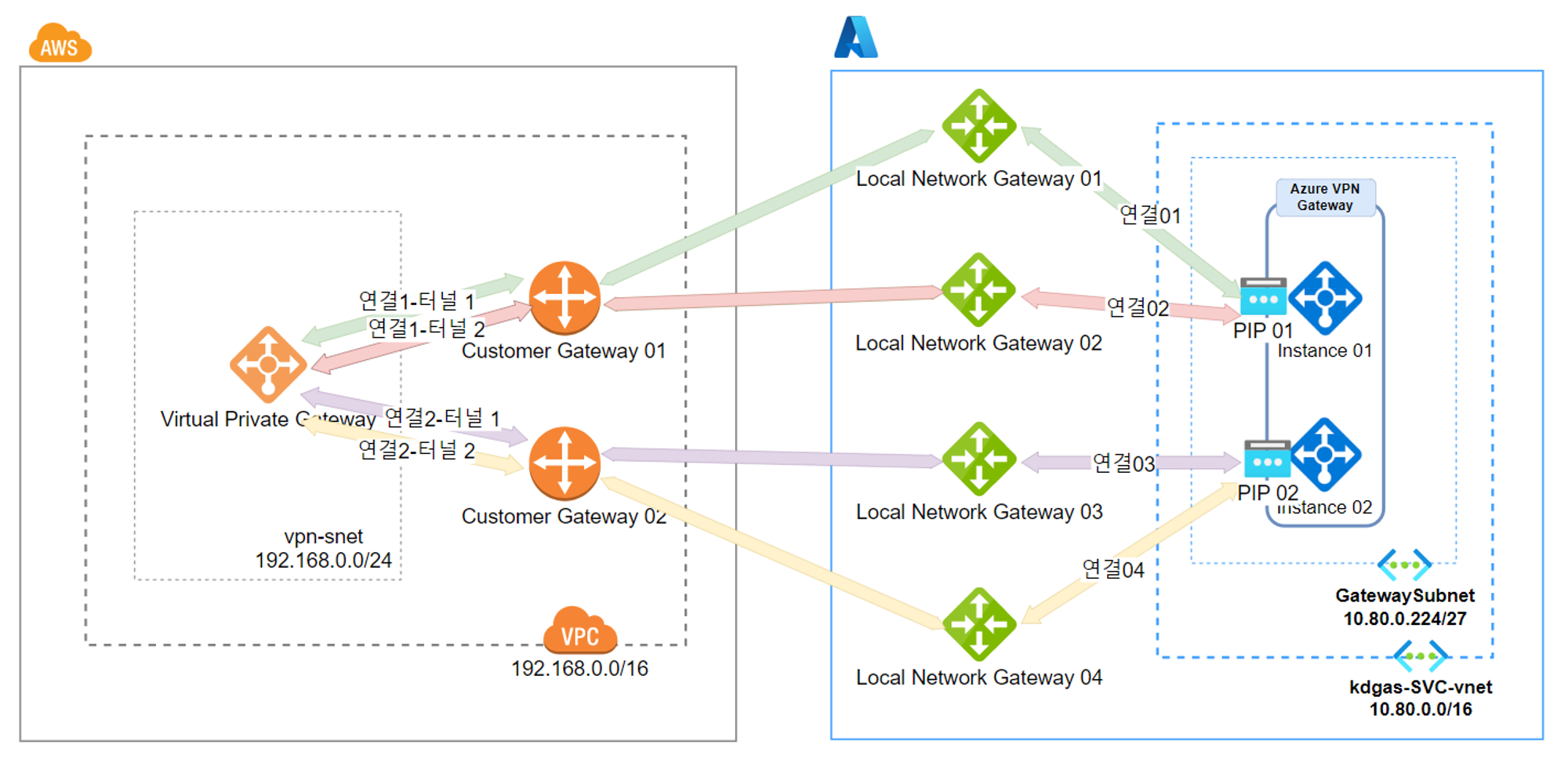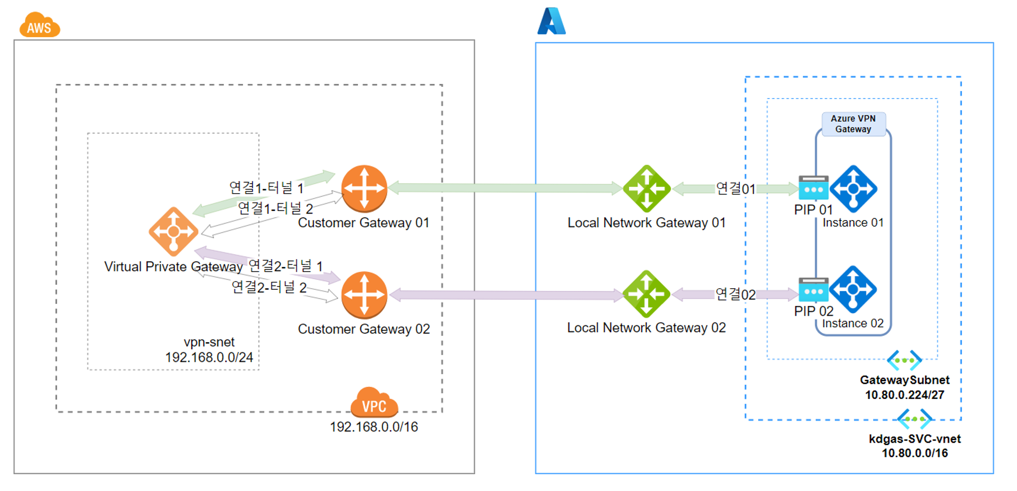 - 가상 프라이빗 게이트웨이 ↔고객 게이트웨이 2번 간의 연결 생성