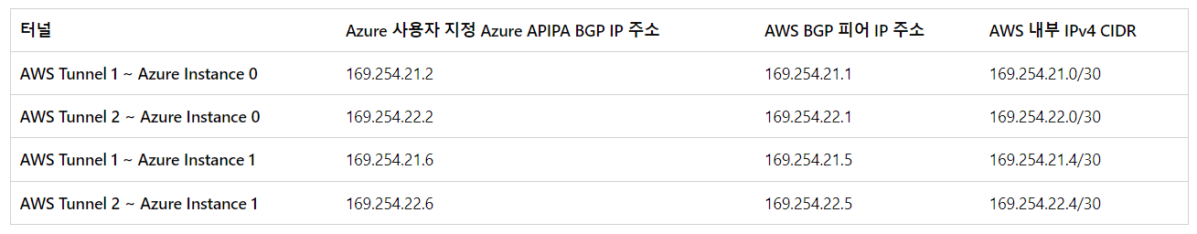 - BGP 피어 IP 주소: 169.254.21.5 (BGP APIPA 구성표 참고)