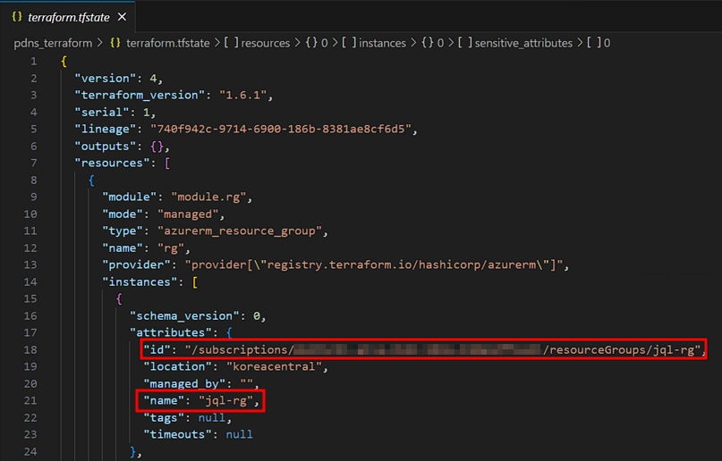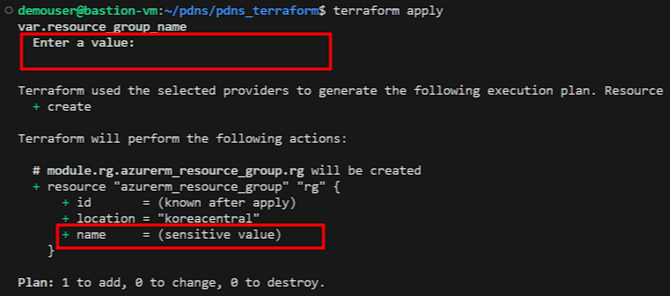 1) variables.tf에서 resource_group_name 변수에 "sensitive = true" 추가