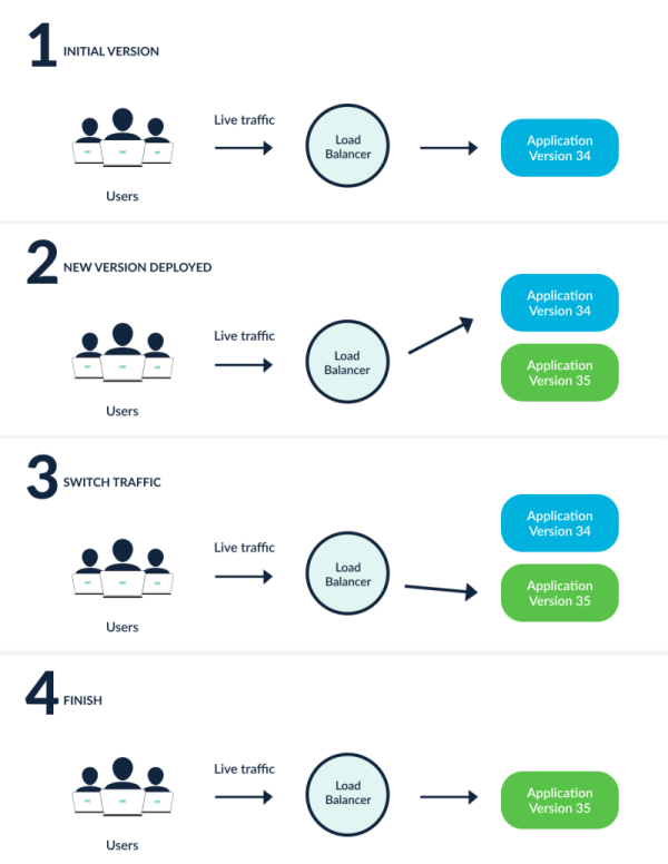 - Blue와 Green의 서버가 동시에 구성되어 있는 상태에서 로드 밸런서가 트래픽을 Blue에서 Green으로 일제히 전환시킨다.