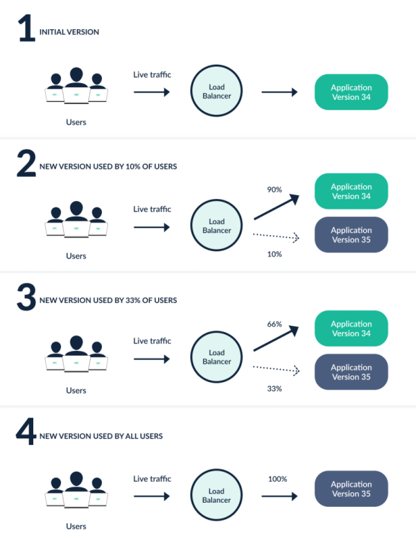 - 가동 중인 서버들의 일부에만 새로운 앱을 배포하여, 일부 트래픽을 새 버전의 환경으로 분산하는 방법이다.