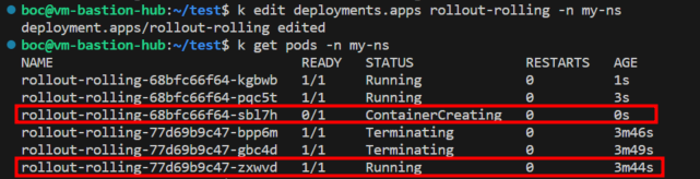 - 클러스터 가동 중지 시간 없이 새 버전을 배포하면서, 새 버전 파드를 하나씩 늘려가고 기존 버전의 파드를 하나씩 줄여나가는 방식이다.