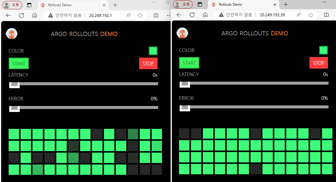 새로운 버전의 replicaset이 배포되면 preview 서비스는 기존의 replicaset(Blue버전)에서 새로운 replicaset(Green버전)으로 트래픽이 변경된다. 이에, preview 서비스 IP로 접속했을 때 Green 버전으로 변경된 것을 확인할 수 있다.