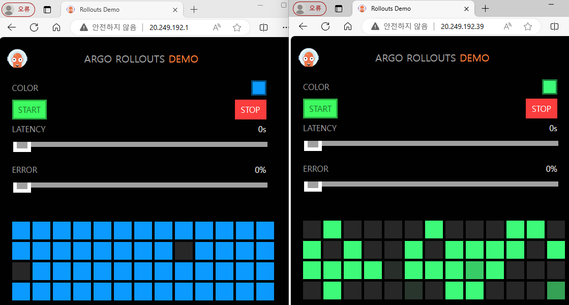 새로운 버전의 replicaset이 배포되면 preview 서비스는 기존의 replicaset(Blue버전)에서 새로운 replicaset(Green버전)으로 트래픽이 변경된다. 이에, preview 서비스 IP로 접속했을 때 Green 버전으로 변경된 것을 확인할 수 있다.