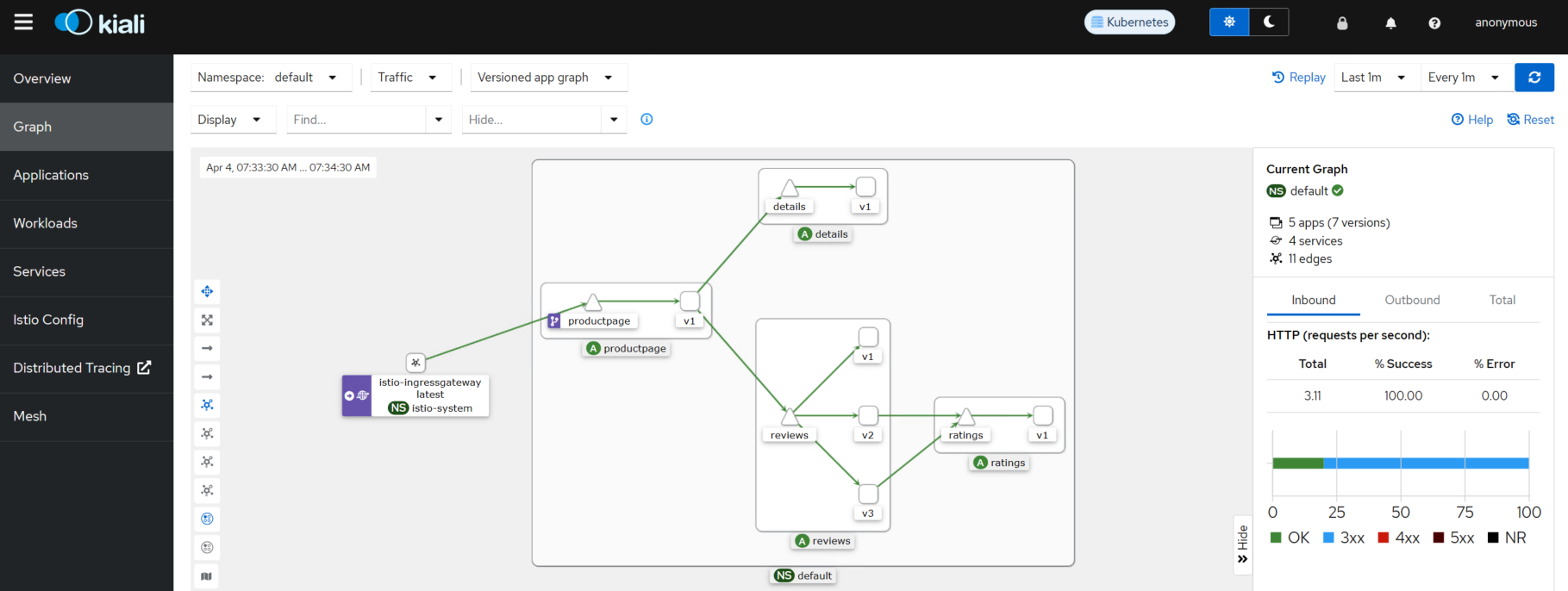 - Kiali 대시보드는 샘플 애플리케이션의 서비스 간 관계와 메시의 개요를 보여준다.
