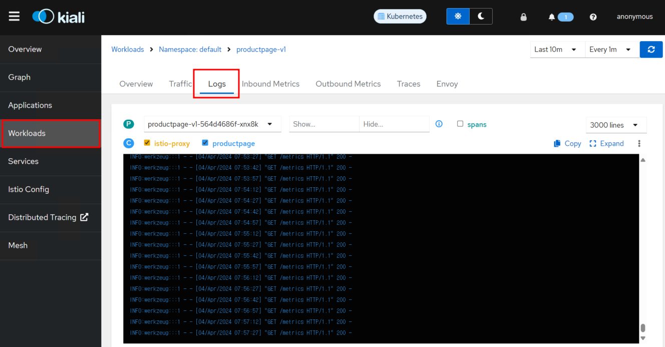 - Workloads에서 Pod들의 Log, In/outbound Metrics 확인도 가능하다.
