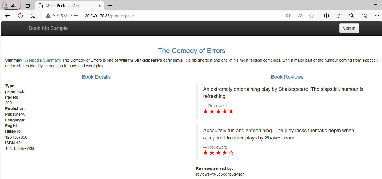- 하기 명령어를 통해 Bookinfo 애플리케이션 주소를 확인한 후 웹 페이지에서 정상적으로 표시되는지 확인한다.