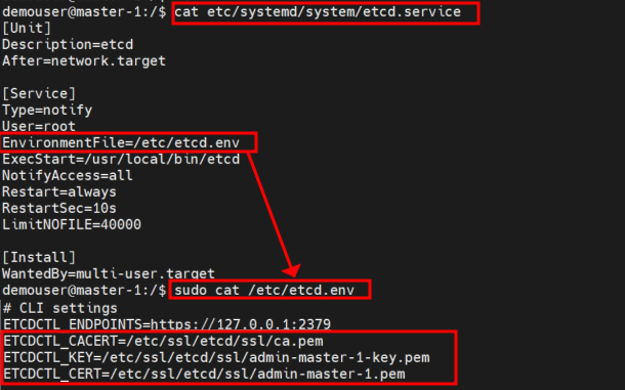 - kubespray를 사용하여 k8s를 설치한 경우 etcd는 pod 형태가 아닌 systemd로 실행되기 때문에, --cacert, --cert, --key 값은 하기 이미지와 같이 /etcd/etcd.env에서 확인할 수 있다.