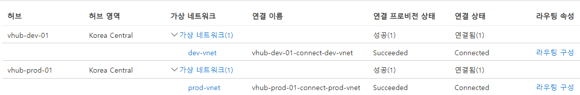 - 본 테스트에서는 vhub-dev-01 가상 허브에 dev-vnet을 연결하고, vhub-prod-01 가상 허브에 prod-vnet을 연결하였다.