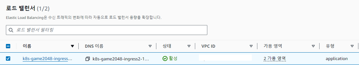 ingress-2048 alb * k8s-game2048-ingress2-11de9430bf-682494172.ap-northeast-2.elb.amazonaws.com 80 104s