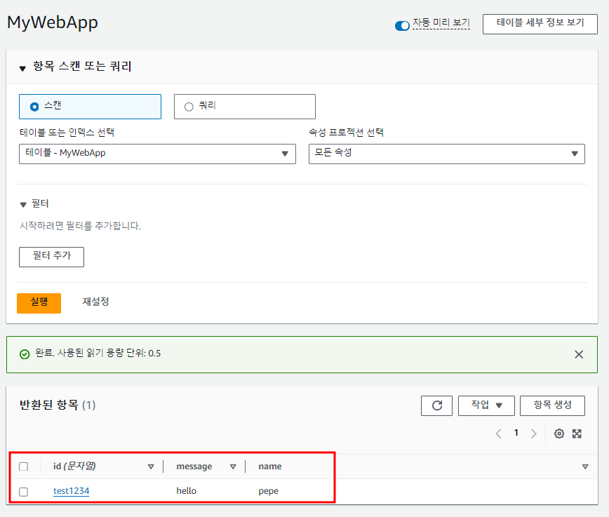 - Dynamo DB에서 테이블 스캔 시 입력된 정보가 저장된 것을 확인할 수 있다.
