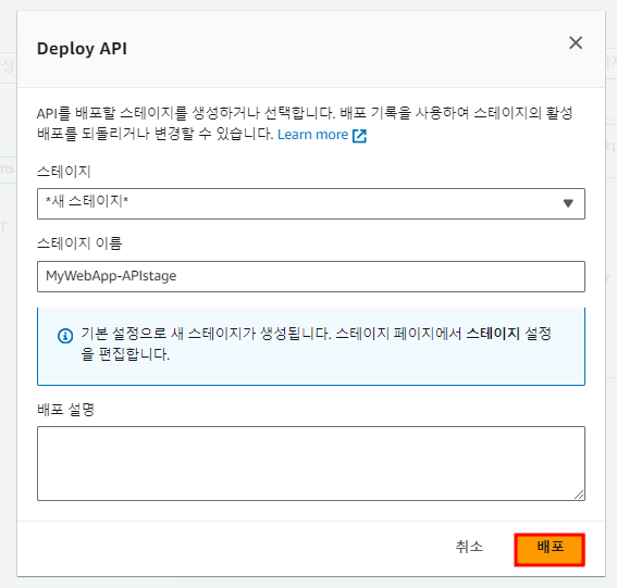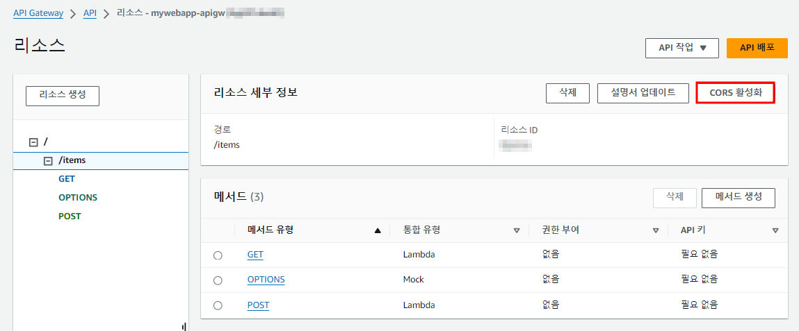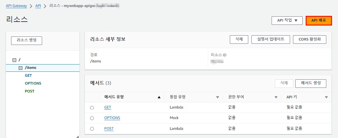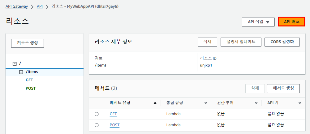 - 설정이 완료되면 [API 배포]를 클릭하여 변경 사항이 적용되도록 한다.