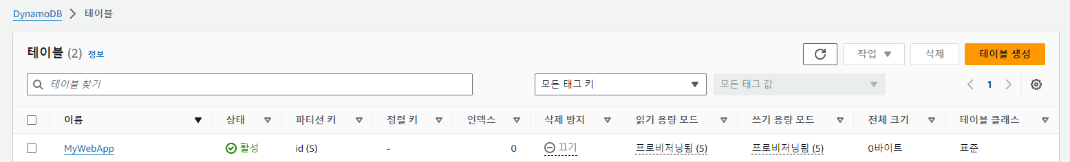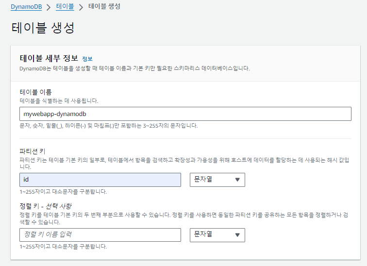 - 테이블 이름: mywebapp-dynamodb (※ 테이블 이름을 다른 것으로 사용할 경우 이어지는 Lambda 함수 코드도 변경 필요)