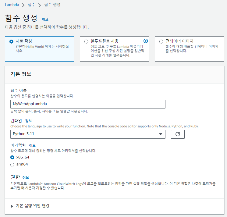 - 하기와 같은 정보를 입력한 후 Lambda 함수를 생성한다.