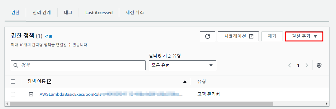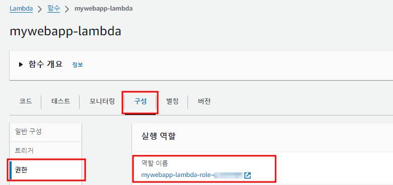 - 생성한 함수로 이동 > [구성] > [권한] > "mywebapp-lambda-role-XXXX" 로 생성된 역할 클릭 > [권한 추가] 클릭
