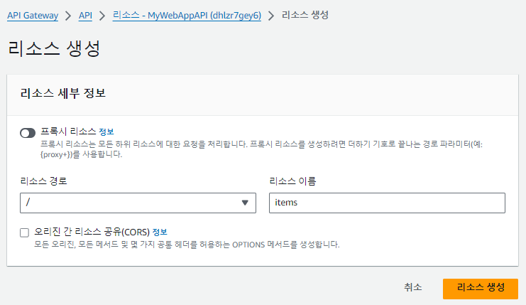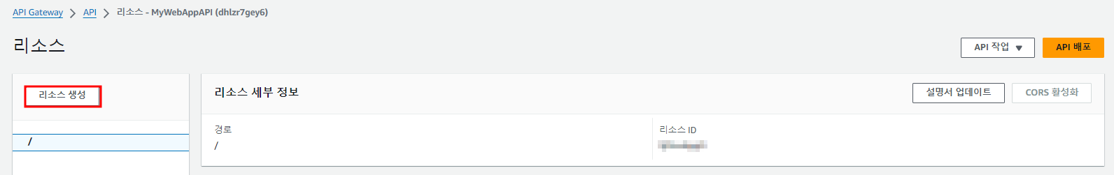 - 생성된 API Gateway에서 [리소스 생성]을 클릭하여 리소스를 생성한다.