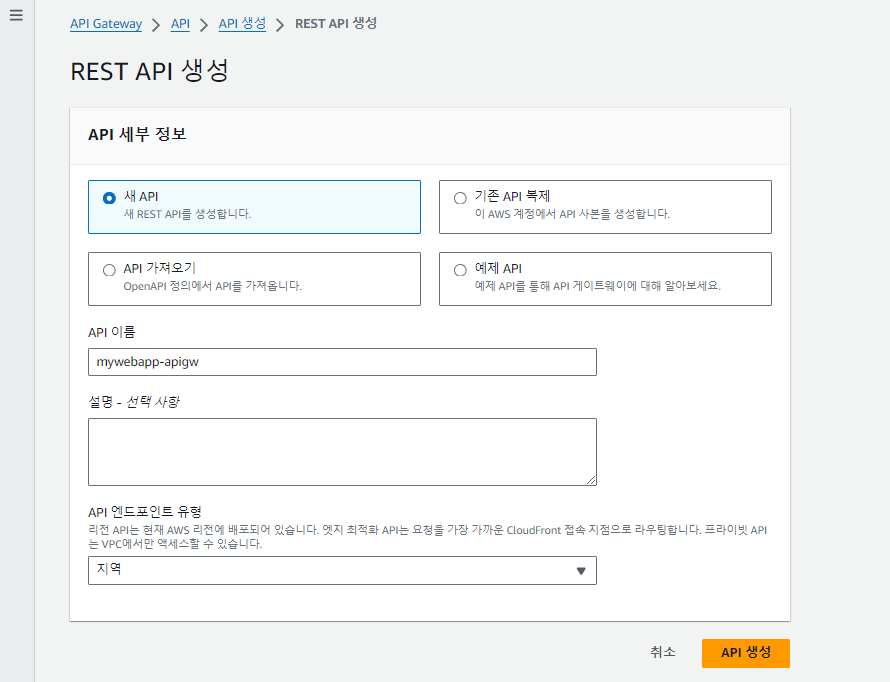 - 하기와 같은 정보를 입력한 후 API Gateway를 생성한다.