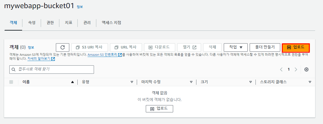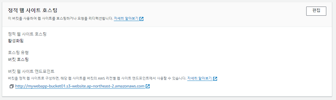 - 생성한 버킷으로 이동한 뒤 [속성] > [정적 웹 사이트 호스팅]에서 버킷 웹사이트 엔드포인트를 확인할 수 있다.