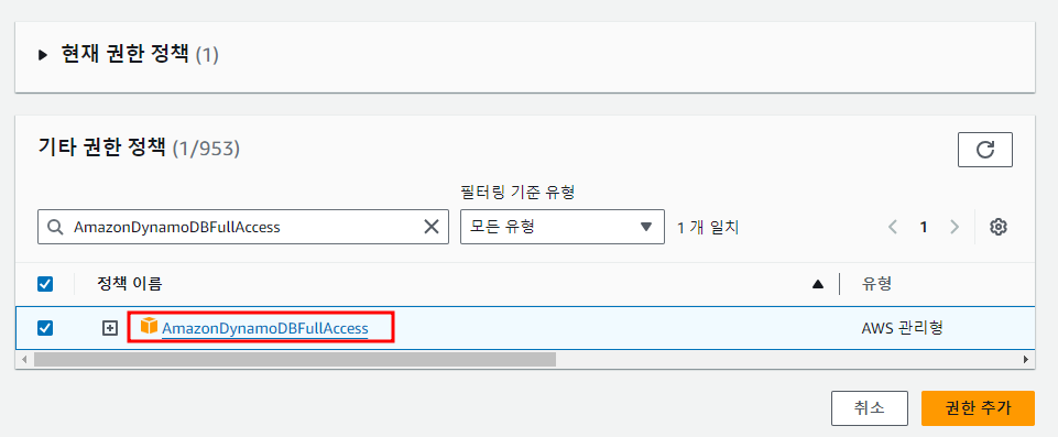 2) Lambda 함수 생성 시 함께 생성된 IAM role에 DynamoDB에 대한 추가 권한 부여