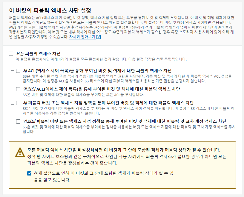 - 모든 퍼블릭 액세스 차단: 모두 해제 (※ S3 버킷을 웹사이트로 호스팅하기 위해서 해제 필요)