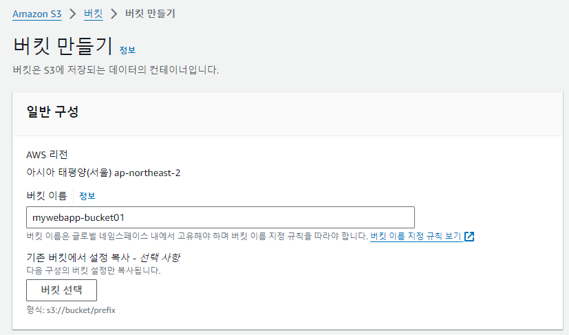 - 하기와 같은 정보를 입력한 후 S3 버킷을 생성한다.