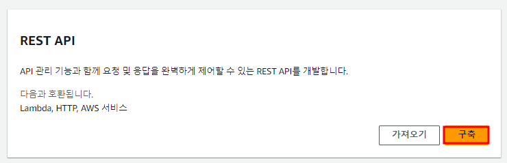 - REST API [구축] 선택 > [새 API] 를 선택한다.