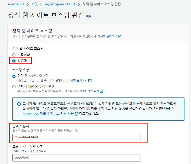 - [활성화]를 선택하고 인덱스 문서에서 업로드할 HTML 파일 이름을 입력한다.