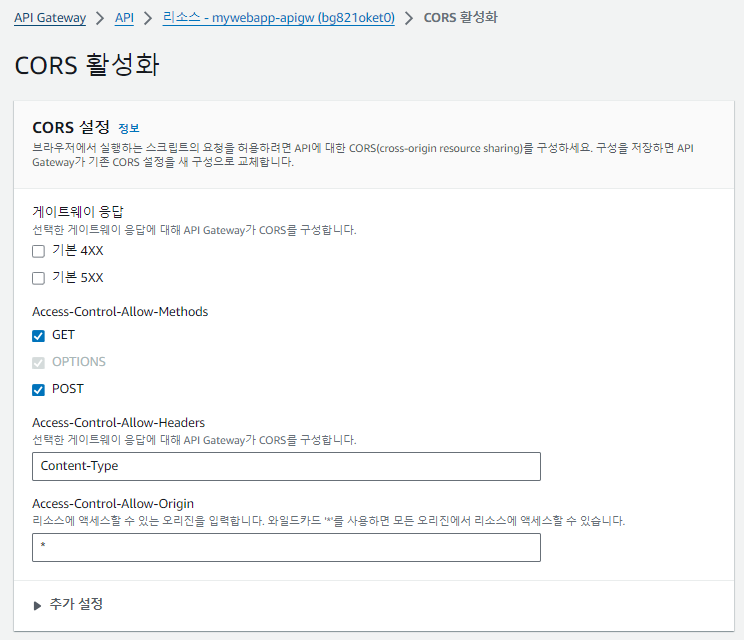 - API Gateway 리소스에서 [CORS 활성화]를 클릭한 후 하기와 같이 설정한다.