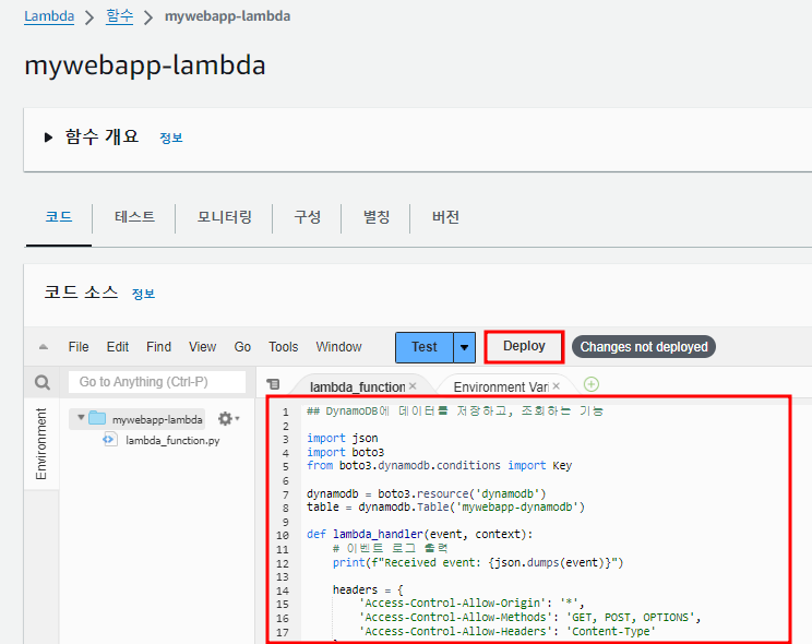 - 생성한 함수로 이동 > [코드]에 하기 코드 입력 후 [Deploy] 클릭