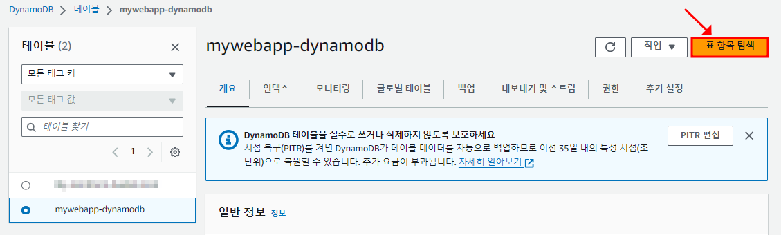 - 생성한 Dynamo DB > [표 항목 탐색] 클릭