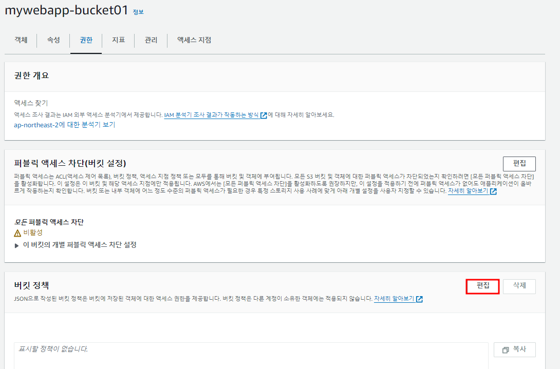 - 생성한 버킷으로 이동한 뒤 [권한] > [버킷 정책]을 클릭한다.